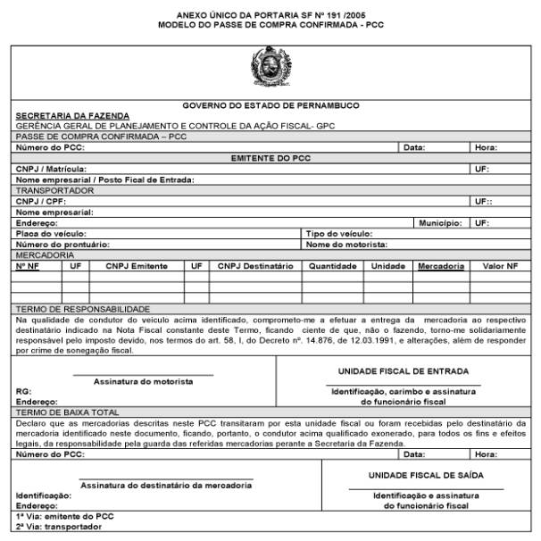 I – Instituir o Passe de Compra Confirmada – PCC, conforme modelo previsto no Anexo Único, para fins de controle do trânsito de álcool etílico hidratado combustível - AEHC, álcool etílico anidro combustível - AEAC ou álcool para outros fins, oriundos desta ou de outra Unidade da Federação e destinados a esta ou a outra Unidade da Federação ou ao exterior;